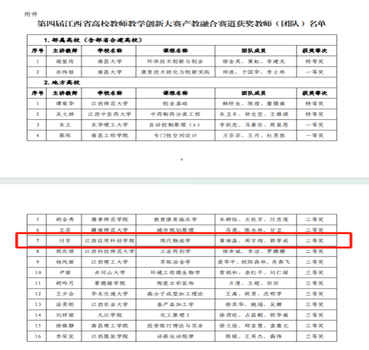 为推动信息技术与教育教学融合创新发展,树立引导全省教师潜心教书育人,打造教学改革的风向标,近日,由江西省教育厅指导、江西省高等教育学会主办的第四届江西省高校教师教学创新大赛产教融合赛道在江西科技师范大学成功举办。经校赛、网络(初赛)评审和现场(决赛)评审,我校付芳老师团队荣获第四届江西省高校教师教学创新大赛产教融合赛道二等奖(民办高校唯一)。